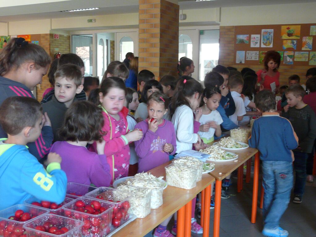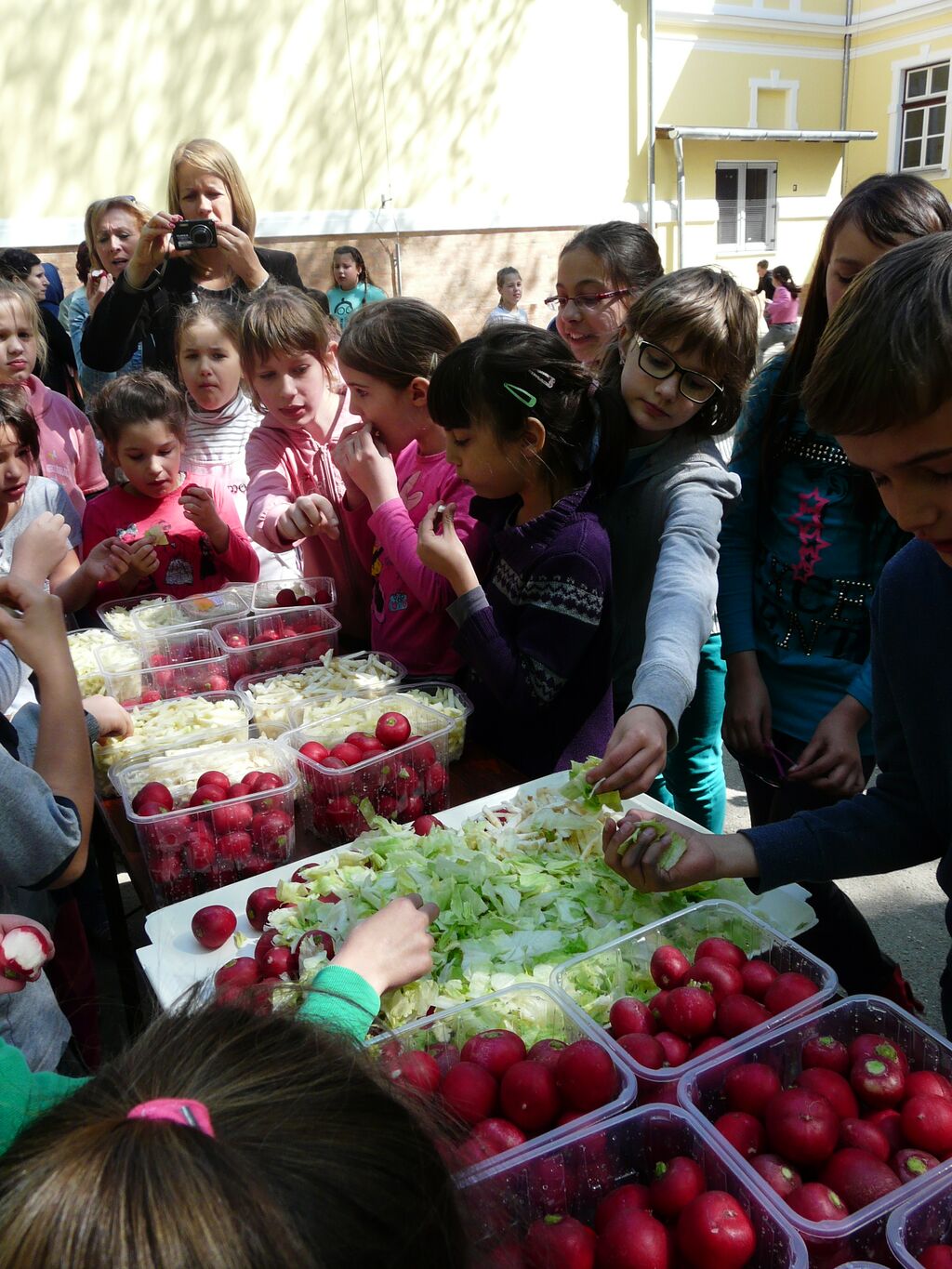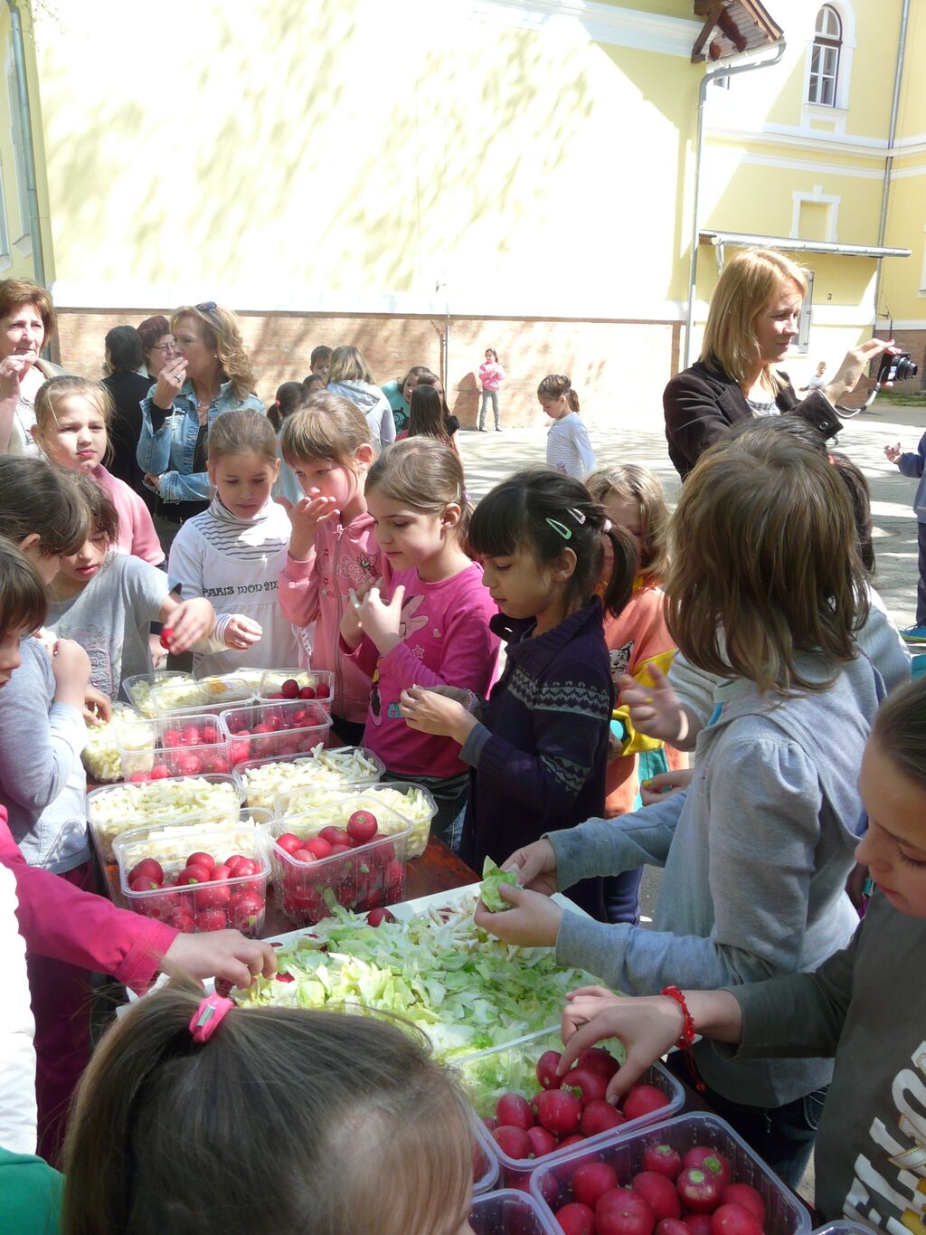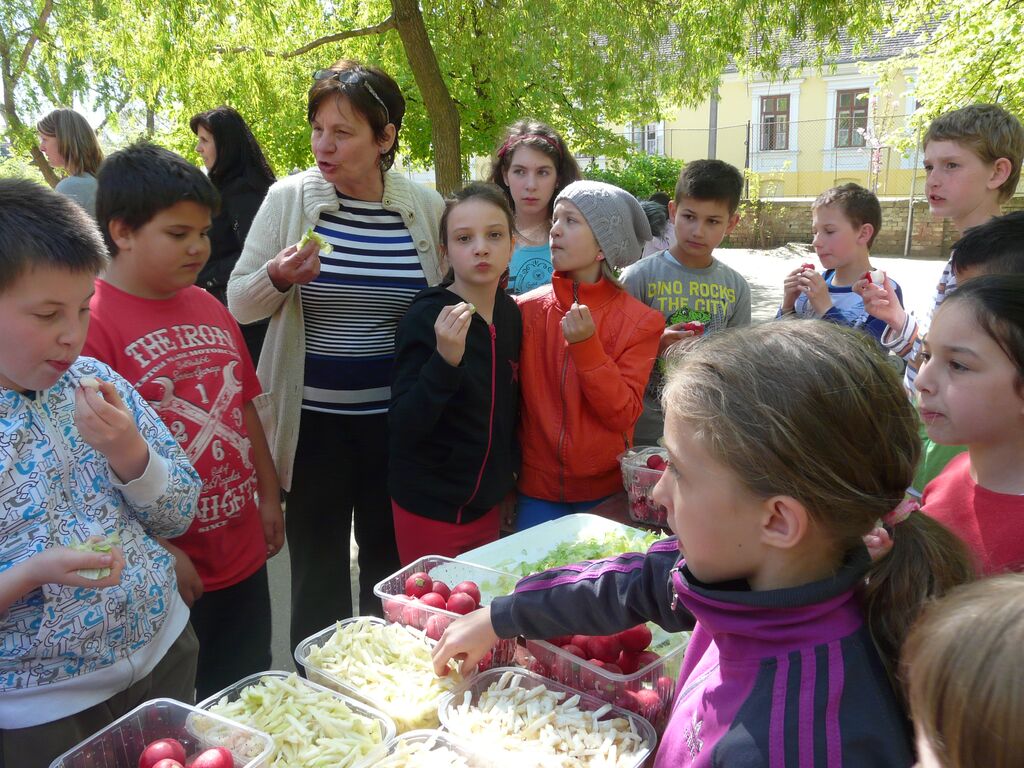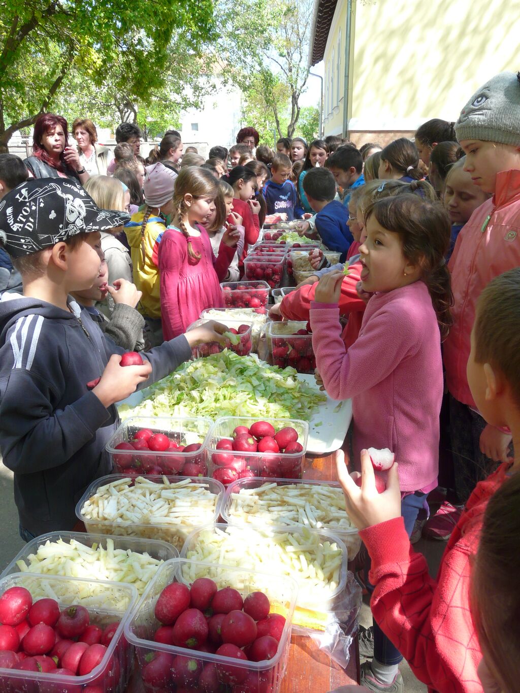 Az Iskolagyümölcs Program kísérő intézkedésének keretében a DélKerTÉSZ először a 2015 tavaszi félévében szervezett kóstoltatást partneriskolái számára. A kóstoltatás során kollégáink az összes iskolába ellátogattak, ahová év közben zöldséget, gyümölcsöt szállítunk. Ez az akció lehetőséget nyújtott a személyes találkozóra a gyerekekkel, nevelőkkel és az ügyintézőkkel. A látogatások alkalmat adtak arra, hogy bemutatkozzunk, és tájékoztassuk a gyerekeket, honnan is érkezik hozzájuk a heti vitaminadag. A kóstoltatásnak természetesen nevelő célzata is van: kivonulásunk alkalmával hangsúlyoztuk a gyerekeknek a zöldség- és gyümölcsfogyasztás fontosságát, a megfelelő vitaminbevitelt és ismertettük az egészséges étrend jellemzőit. Emellett egy tájékoztató anyag is kiosztásra került, melyben bemutattuk az éppen kínált zöldségek és gyümölcsök jellemzőit, információkat nyújtottunk a növények eredetéről, vitamintartalmáról, egészségre gyakorolt jótékony hatásukról, valamint fogyasztási tanácsokat is összegyűjtöttünk a gyerekek számára. Sok gyermek számára nem volt minden kínált zöldség és gyümölcs ismert, így szerepünk volt azok megismertetésében, a változatos táplálkozás bemutatásában. Tapasztalataink szerint sok családban nem megfelelő gyakorisággal kerül az asztalra zöldség és gyümölcs, a gyerekek csak az alapvető fajokat ismerik, az ismeretlen ételektől ódzkodnak. A kóstoltatás alkalmat adott arra, hogy bátorítsuk őket a szokatlanabb zöldség- és gyümölcsfélék megkóstolására is, mint például a zeller. Nagy népszerűségnek örvendett a gyerekek körében az eper, cseresznye, és a meggy, zöldségek közül pedig a saláta és a kígyóuborka. Sikernek tekintjük, hogy a kollégáink és a nevelők mintájára, bíztatásra a kevésbé kedvelt zöldségeket (retek, karalábé, zeller) is megízlelték a gyermekek. Bízunk benne, hogy a program segítségével sikerült kissé kibővítenünk a gyerekek zöldségekről és gyümölcsökről alkotott képét, új ízeket megismertetni velük, melyeket a jövőben akár otthon, szüleiktől is kérni fognak egy-egy étkezés alkalmával.