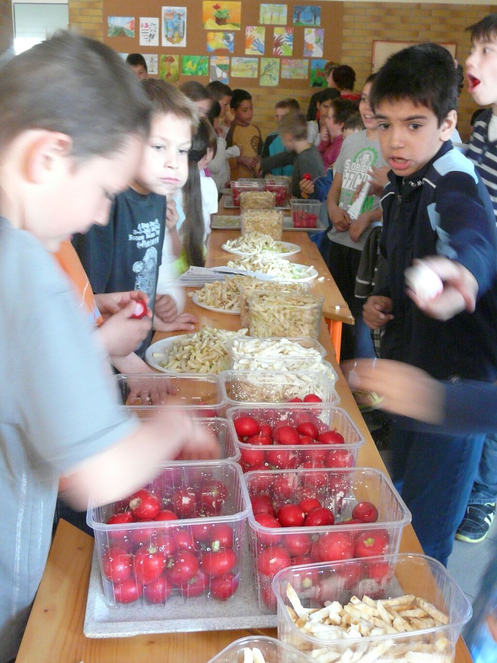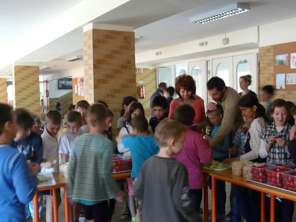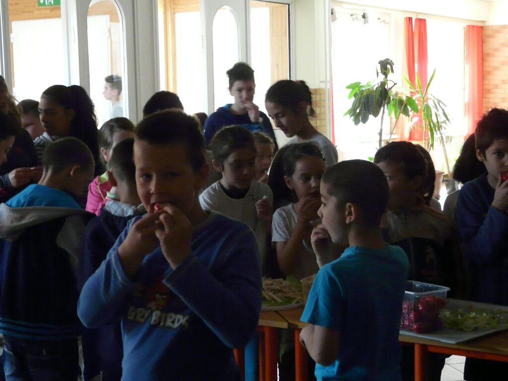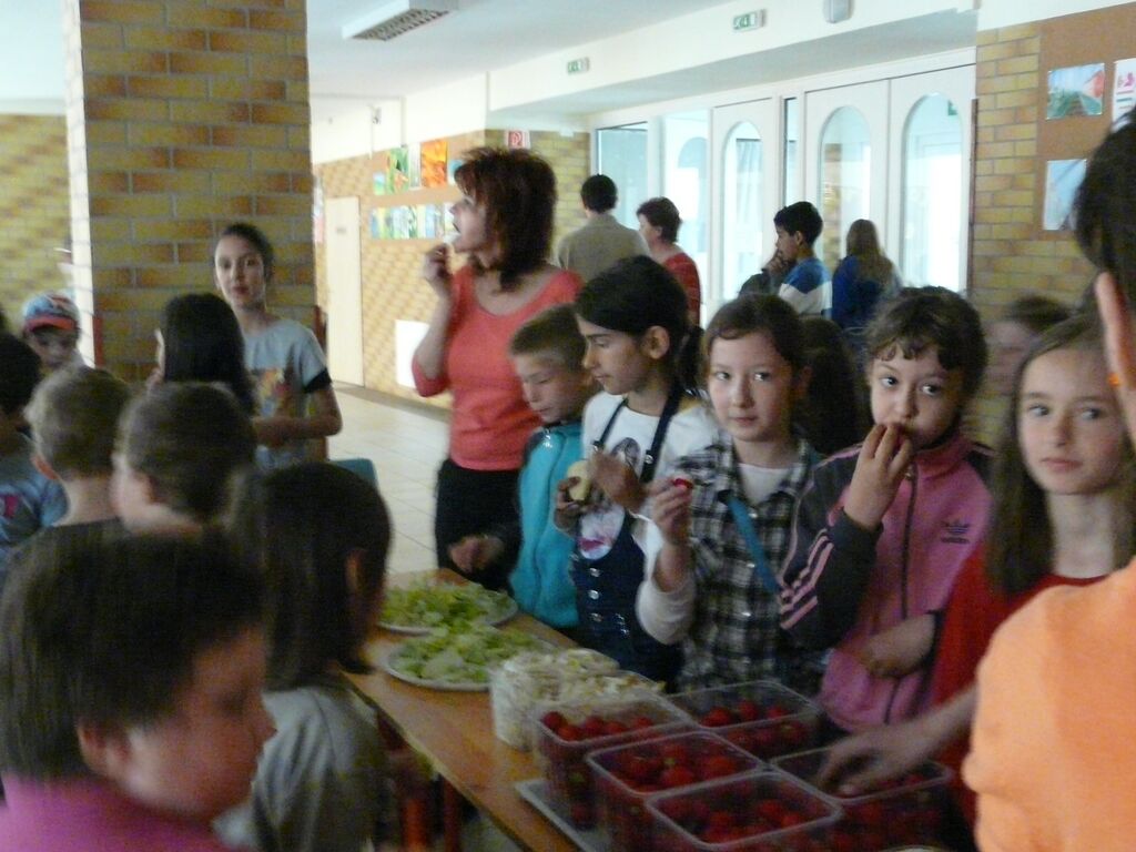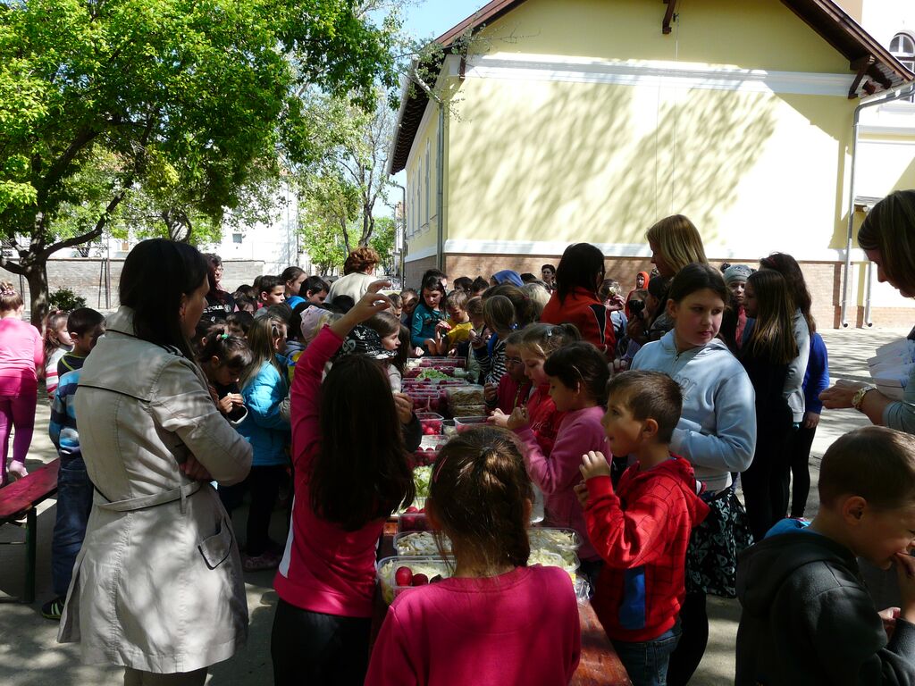 Az Iskolagyümölcs Program kísérő intézkedésének keretében a DélKerTÉSZ először a 2015 tavaszi félévében szervezett kóstoltatást partneriskolái számára. A kóstoltatás során kollégáink az összes iskolába ellátogattak, ahová év közben zöldséget, gyümölcsöt szállítunk. Ez az akció lehetőséget nyújtott a személyes találkozóra a gyerekekkel, nevelőkkel és az ügyintézőkkel. A látogatások alkalmat adtak arra, hogy bemutatkozzunk, és tájékoztassuk a gyerekeket, honnan is érkezik hozzájuk a heti vitaminadag. A kóstoltatásnak természetesen nevelő célzata is van: kivonulásunk alkalmával hangsúlyoztuk a gyerekeknek a zöldség- és gyümölcsfogyasztás fontosságát, a megfelelő vitaminbevitelt és ismertettük az egészséges étrend jellemzőit. Emellett egy tájékoztató anyag is kiosztásra került, melyben bemutattuk az éppen kínált zöldségek és gyümölcsök jellemzőit, információkat nyújtottunk a növények eredetéről, vitamintartalmáról, egészségre gyakorolt jótékony hatásukról, valamint fogyasztási tanácsokat is összegyűjtöttünk a gyerekek számára. Sok gyermek számára nem volt minden kínált zöldség és gyümölcs ismert, így szerepünk volt azok megismertetésében, a változatos táplálkozás bemutatásában. Tapasztalataink szerint sok családban nem megfelelő gyakorisággal kerül az asztalra zöldség és gyümölcs, a gyerekek csak az alapvető fajokat ismerik, az ismeretlen ételektől ódzkodnak. A kóstoltatás alkalmat adott arra, hogy bátorítsuk őket a szokatlanabb zöldség- és gyümölcsfélék megkóstolására is, mint például a zeller. Nagy népszerűségnek örvendett a gyerekek körében az eper, cseresznye, és a meggy, zöldségek közül pedig a saláta és a kígyóuborka. Sikernek tekintjük, hogy a kollégáink és a nevelők mintájára, bíztatásra a kevésbé kedvelt zöldségeket (retek, karalábé, zeller) is megízlelték a gyermekek. Bízunk benne, hogy a program segítségével sikerült kissé kibővítenünk a gyerekek zöldségekről és gyümölcsökről alkotott képét, új ízeket megismertetni velük, melyeket a jövőben akár otthon, szüleiktől is kérni fognak egy-egy étkezés alkalmával.