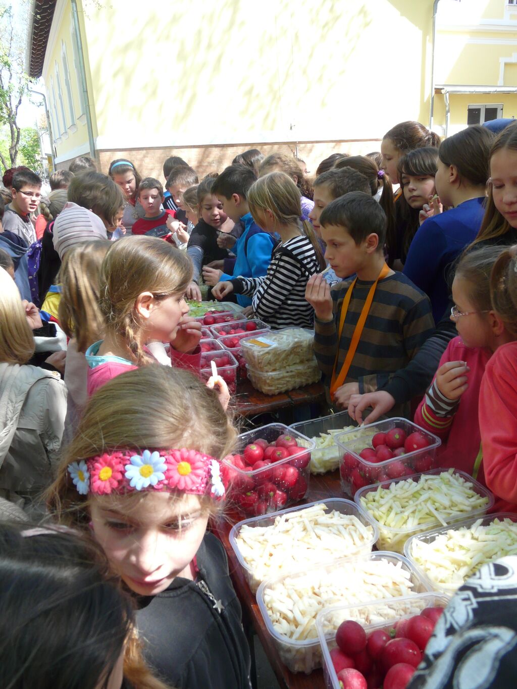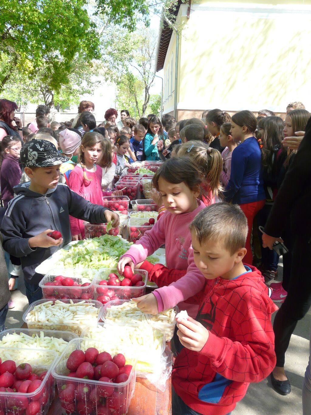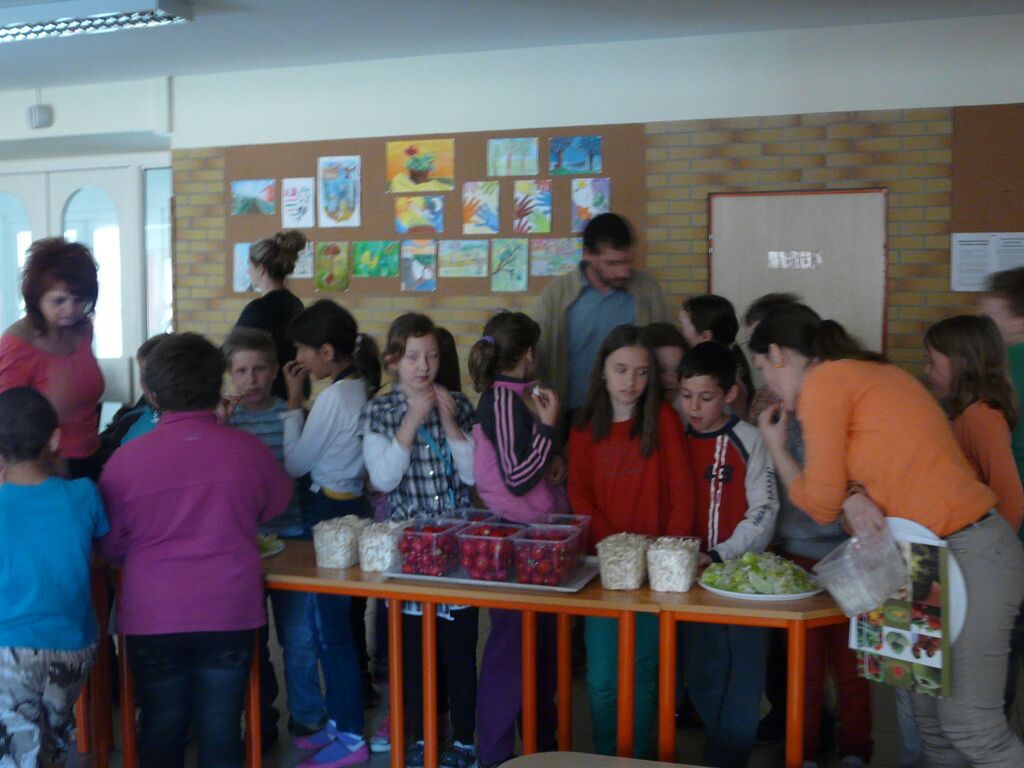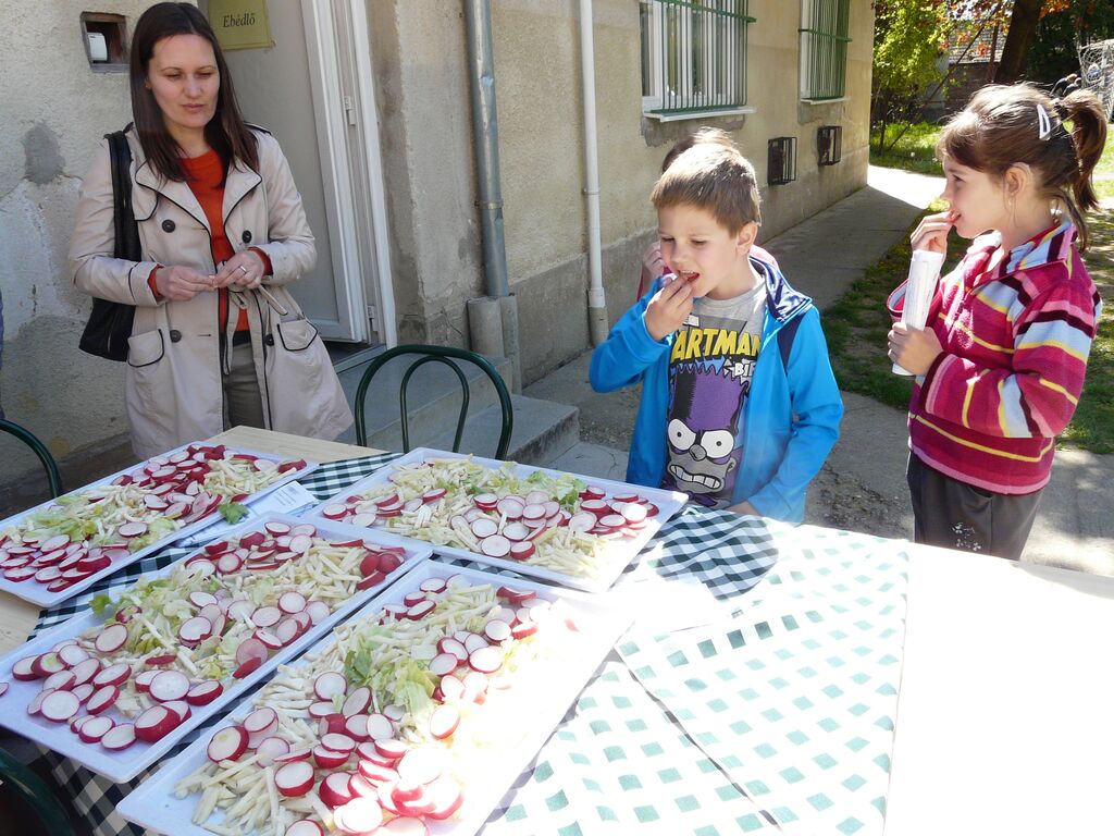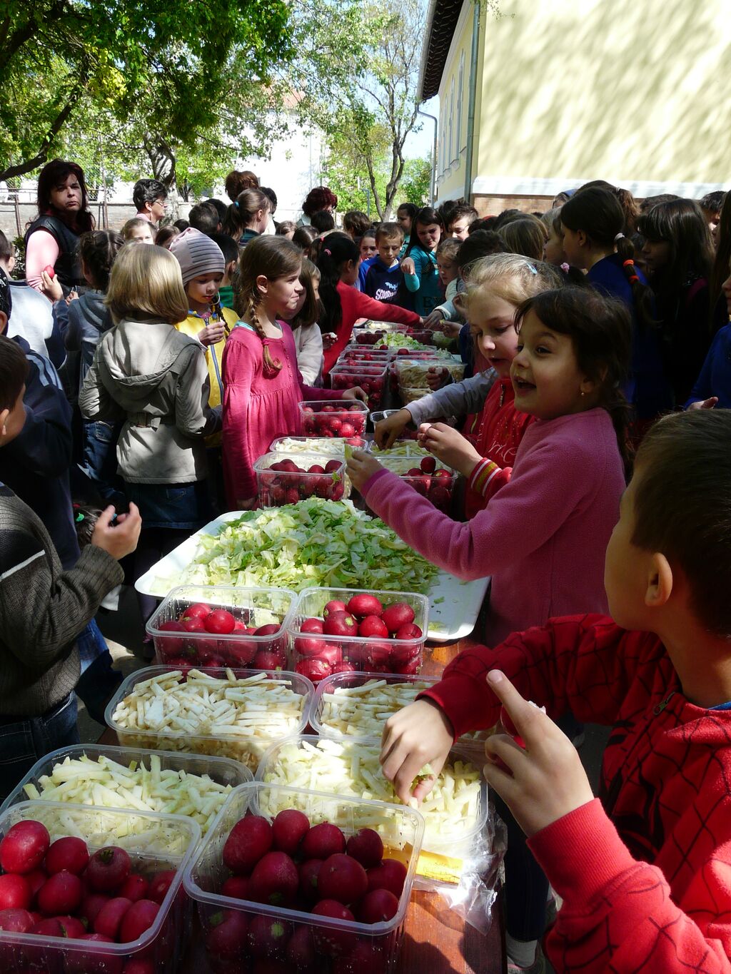 Az Iskolagyümölcs Program kísérő intézkedésének keretében a DélKerTÉSZ először a 2015 tavaszi félévében szervezett kóstoltatást partneriskolái számára. A kóstoltatás során kollégáink az összes iskolába ellátogattak, ahová év közben zöldséget, gyümölcsöt szállítunk. Ez az akció lehetőséget nyújtott a személyes találkozóra a gyerekekkel, nevelőkkel és az ügyintézőkkel. A látogatások alkalmat adtak arra, hogy bemutatkozzunk, és tájékoztassuk a gyerekeket, honnan is érkezik hozzájuk a heti vitaminadag. A kóstoltatásnak természetesen nevelő célzata is van: kivonulásunk alkalmával hangsúlyoztuk a gyerekeknek a zöldség- és gyümölcsfogyasztás fontosságát, a megfelelő vitaminbevitelt és ismertettük az egészséges étrend jellemzőit. Emellett egy tájékoztató anyag is kiosztásra került, melyben bemutattuk az éppen kínált zöldségek és gyümölcsök jellemzőit, információkat nyújtottunk a növények eredetéről, vitamintartalmáról, egészségre gyakorolt jótékony hatásukról, valamint fogyasztási tanácsokat is összegyűjtöttünk a gyerekek számára. Sok gyermek számára nem volt minden kínált zöldség és gyümölcs ismert, így szerepünk volt azok megismertetésében, a változatos táplálkozás bemutatásában. Tapasztalataink szerint sok családban nem megfelelő gyakorisággal kerül az asztalra zöldség és gyümölcs, a gyerekek csak az alapvető fajokat ismerik, az ismeretlen ételektől ódzkodnak. A kóstoltatás alkalmat adott arra, hogy bátorítsuk őket a szokatlanabb zöldség- és gyümölcsfélék megkóstolására is, mint például a zeller. Nagy népszerűségnek örvendett a gyerekek körében az eper, cseresznye, és a meggy, zöldségek közül pedig a saláta és a kígyóuborka. Sikernek tekintjük, hogy a kollégáink és a nevelők mintájára, bíztatásra a kevésbé kedvelt zöldségeket (retek, karalábé, zeller) is megízlelték a gyermekek. Bízunk benne, hogy a program segítségével sikerült kissé kibővítenünk a gyerekek zöldségekről és gyümölcsökről alkotott képét, új ízeket megismertetni velük, melyeket a jövőben akár otthon, szüleiktől is kérni fognak egy-egy étkezés alkalmával.