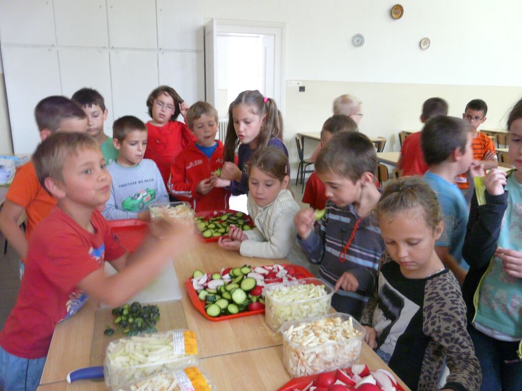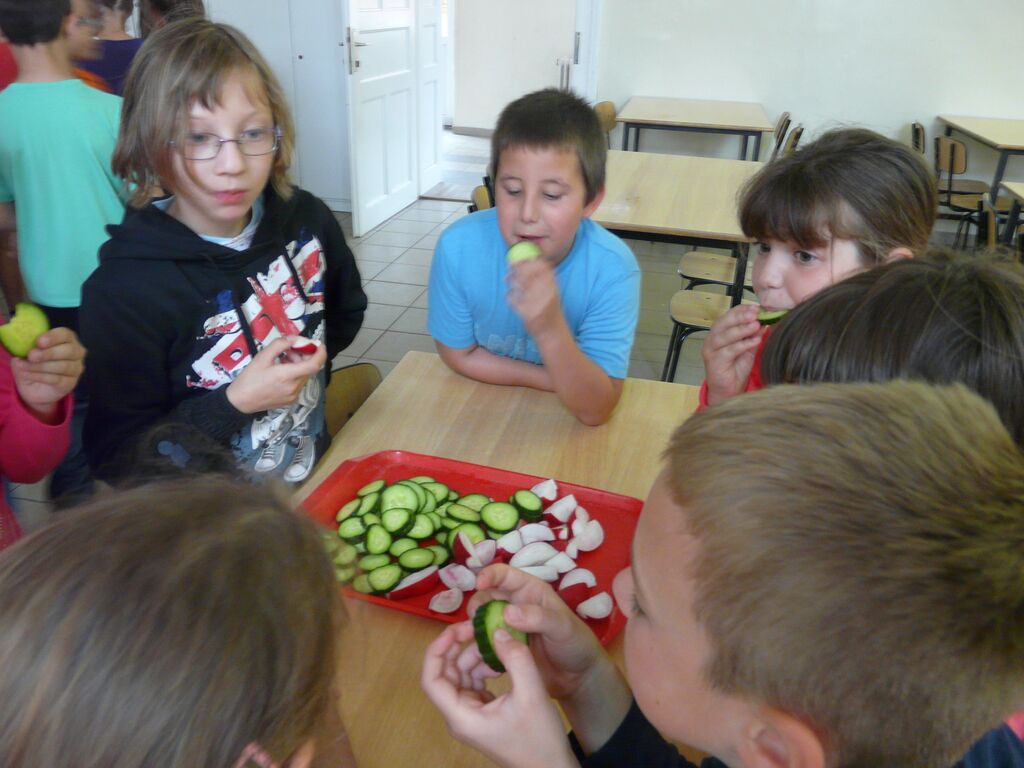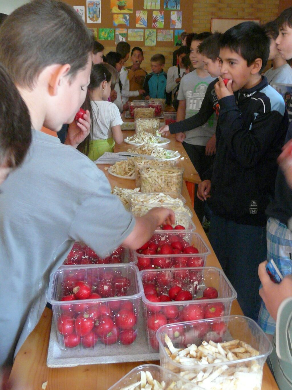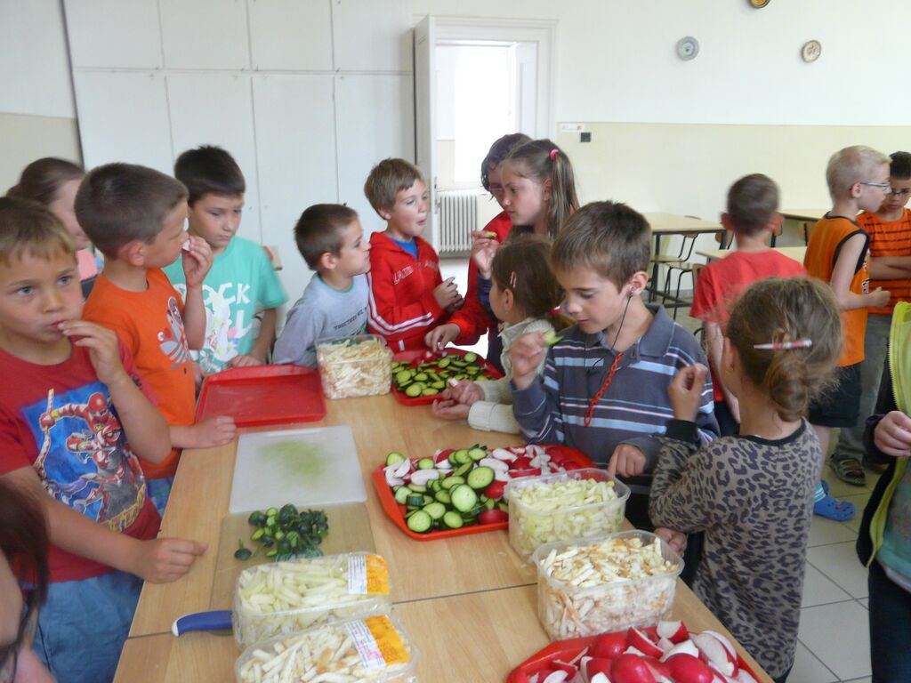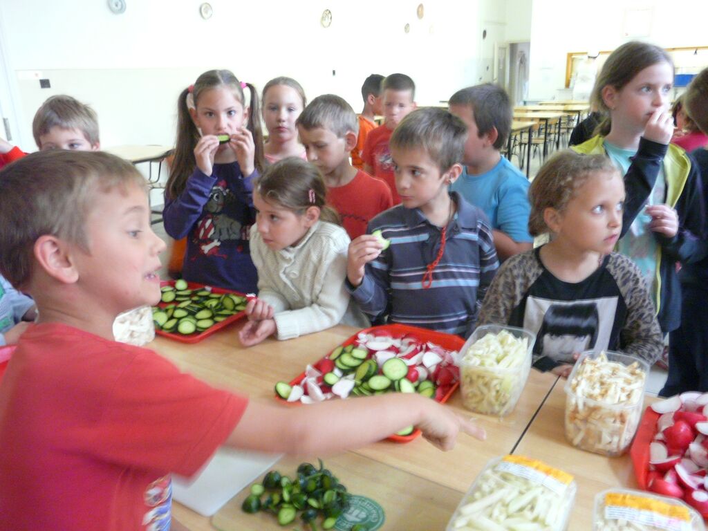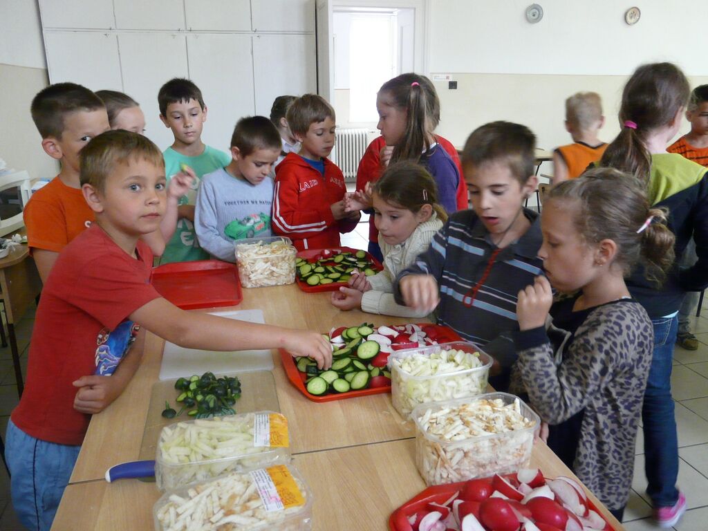 Az Iskolagyümölcs Program kísérő intézkedésének keretében a DélKerTÉSZ először a 2015 tavaszi félévében szervezett kóstoltatást partneriskolái számára. A kóstoltatás során kollégáink az összes iskolába ellátogattak, ahová év közben zöldséget, gyümölcsöt szállítunk. Ez az akció lehetőséget nyújtott a személyes találkozóra a gyerekekkel, nevelőkkel és az ügyintézőkkel. A látogatások alkalmat adtak arra, hogy bemutatkozzunk, és tájékoztassuk a gyerekeket, honnan is érkezik hozzájuk a heti vitaminadag. A kóstoltatásnak természetesen nevelő célzata is van: kivonulásunk alkalmával hangsúlyoztuk a gyerekeknek a zöldség- és gyümölcsfogyasztás fontosságát, a megfelelő vitaminbevitelt és ismertettük az egészséges étrend jellemzőit. Emellett egy tájékoztató anyag is kiosztásra került, melyben bemutattuk az éppen kínált zöldségek és gyümölcsök jellemzőit, információkat nyújtottunk a növények eredetéről, vitamintartalmáról, egészségre gyakorolt jótékony hatásukról, valamint fogyasztási tanácsokat is összegyűjtöttünk a gyerekek számára. Sok gyermek számára nem volt minden kínált zöldség és gyümölcs ismert, így szerepünk volt azok megismertetésében, a változatos táplálkozás bemutatásában. Tapasztalataink szerint sok családban nem megfelelő gyakorisággal kerül az asztalra zöldség és gyümölcs, a gyerekek csak az alapvető fajokat ismerik, az ismeretlen ételektől ódzkodnak. A kóstoltatás alkalmat adott arra, hogy bátorítsuk őket a szokatlanabb zöldség- és gyümölcsfélék megkóstolására is, mint például a zeller. Nagy népszerűségnek örvendett a gyerekek körében az eper, cseresznye, és a meggy, zöldségek közül pedig a saláta és a kígyóuborka. Sikernek tekintjük, hogy a kollégáink és a nevelők mintájára, bíztatásra a kevésbé kedvelt zöldségeket (retek, karalábé, zeller) is megízlelték a gyermekek. Bízunk benne, hogy a program segítségével sikerült kissé kibővítenünk a gyerekek zöldségekről és gyümölcsökről alkotott képét, új ízeket megismertetni velük, melyeket a jövőben akár otthon, szüleiktől is kérni fognak egy-egy étkezés alkalmával.